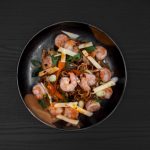 • Verhit een pan op middelhoog vuur en bak de gekruide Black Tiger garnalen tot ze roze kleuren. Haal de garnalen uit de pan en zet ze opzij.